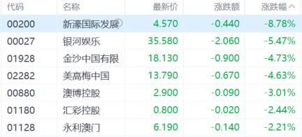 濠赌股延续下跌行情,新濠国际发展跌超8%,银河娱乐跌超5%,金沙中国、美高梅中国、永利澳门等跟跌。