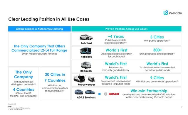 根据灼识咨询的资料,文远知行是全球首家在7个国家30个城市进行产品运营和测试的自动驾驶公司,同时也是全球唯一一家在四个国家(中国、阿联酋、新加坡、美国)获得自动驾驶车辆测试许可的自动驾驶公司。