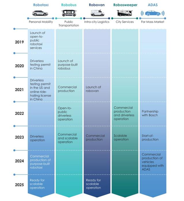 成立于2017年的文远知行作为一家自动驾驶科技公司,现提供从L2到L4级的自动驾驶产品和服务,可满足开放道路上最广泛应用场景中的绝大多数交通需求,现已形成自动驾驶出租车(Robotaxi)、自动驾驶小巴(Robobus)、自动驾驶货运车(Robovan)、自动驾驶环卫车(Robosweeper)、高阶智能驾驶(Advanced Driving Solution)等五大产品矩阵,提供网约车、随需公交、同城货运、智能环卫、高阶智能驾驶解决方案等多种服务。