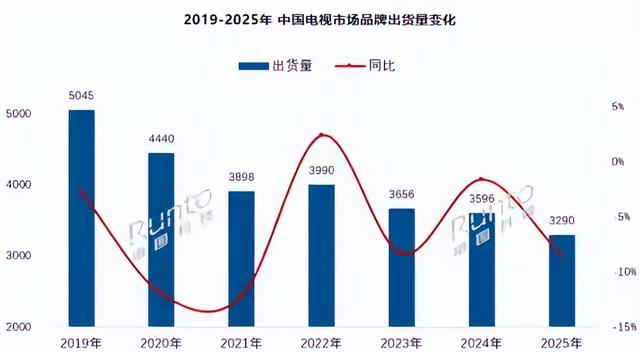 根据洛图科技(RUNTO)发布的年度报告,2025年中国电视市场在多重压力下持续探底,全年品牌整机出货量为3289.5万台,同比下滑8.5%,创下自2010年以来的十六年历史新低。