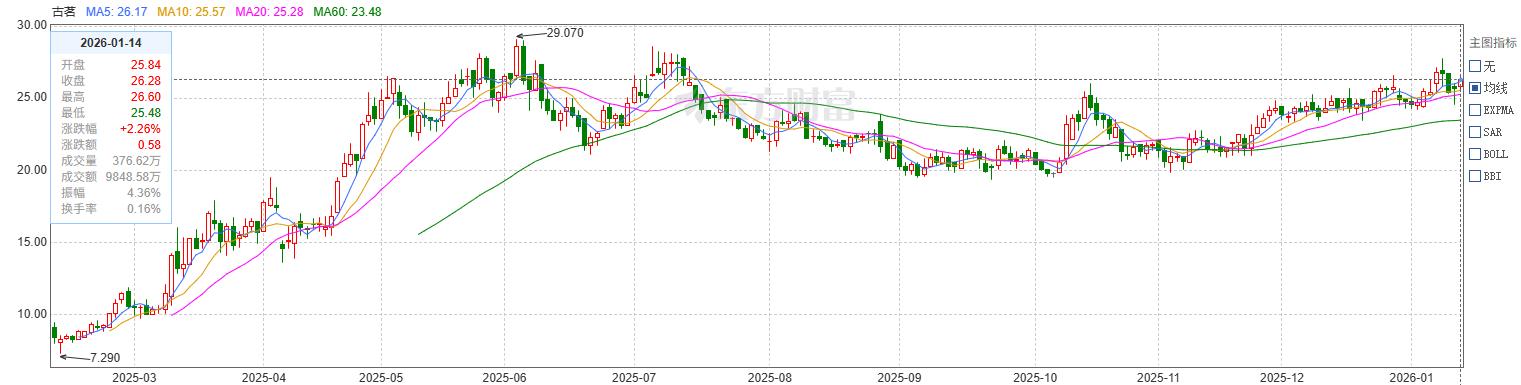 2025年2月登陆港交所以来,古茗股价持续上行,市值稳步增长。截至1月14日收盘,古茗股价为26.28港元/股,对比上市9.94港元/股上涨164.39%,总市值为625.0亿港元。
