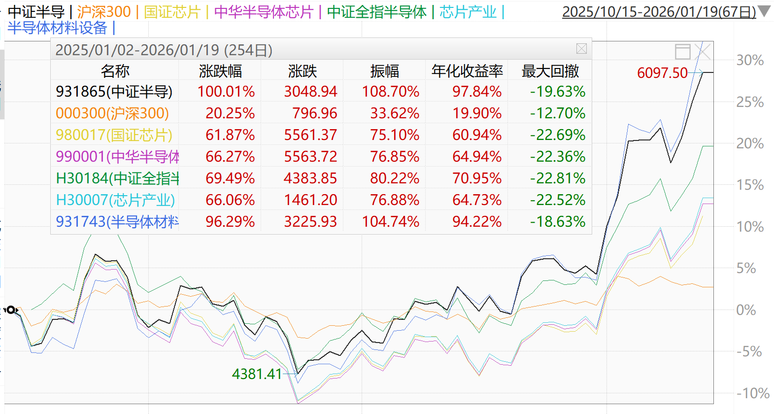 半导体设备ETF(561980)跟踪中证半导,芯片产业链上/中游设备+材料+芯片设计三行业占比超90%。由于对“卖铲子”龙头高度聚焦,该指数较同类指数呈现更高弹性——2025年至今涨幅实现翻倍、上一轮半导体周期(2018年)至今最大涨幅近670%,均在同类指数中位居第一。