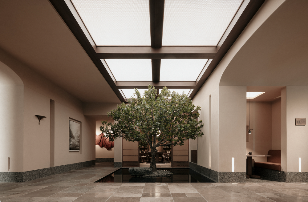 在【亚朵见野】中,来自云南的土布、土墙、藤编,以及傈僳族象形⽂字为灵感的视觉标志,甚至还复刻出高黎贡山百年茶树……这些在地文化的现代编译,让客户能直接代入到来自云南亚朵山村的自然闲寂。