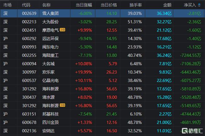 龙虎榜单日净卖出额前三为雪人集团、大为股份、远达环保,分别为2.81亿元、2.36亿元、1.4亿元。