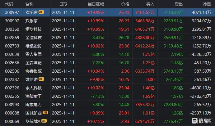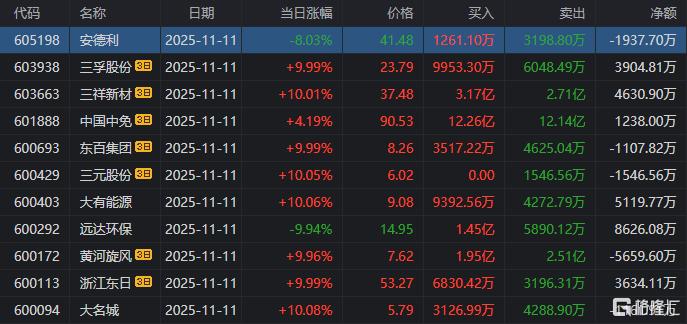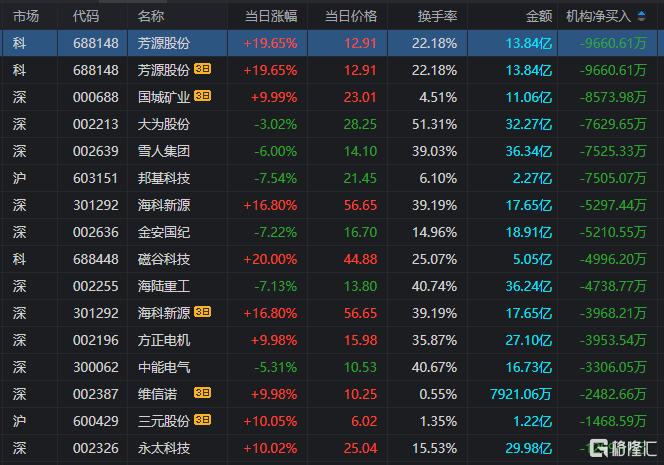 龙虎榜单日净买入额前三为炬华科技、四方达、大有能源,分别为4.48亿元、1.63亿元、1.14亿元。