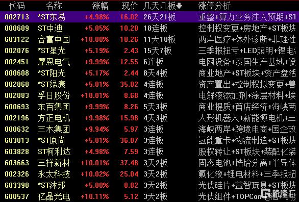 高位股方面,合富中国走出11天10板,摩恩电气晋级6连板,锂电池板块延续强势,孚日股份4连板、国城矿业2连板、永太科技3天2板。