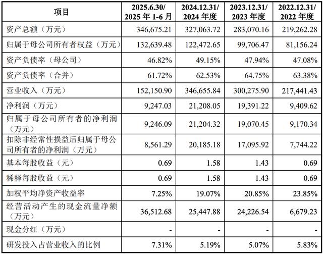 2022年、2023年、2024年度和2025年上半年,埃泰克的营收分别约为21.74亿元、30.08亿元、34.68亿元和15.22亿元,净利润分别约9414.40万元、1.97亿元、2.13亿元和9247.03万元,扣非后净利润分别约7749.01万元、1.74亿元、2.03亿元和8561.29万元。