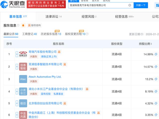天眼查App信息显示,埃泰克成立于2002年12月,位于安徽省芜湖市。目前,该公司的注册资本约为1.34亿元,法定代表人为Chen Zejian(陈泽坚),主要股东包括奇瑞汽车、小米长江产业基金等。