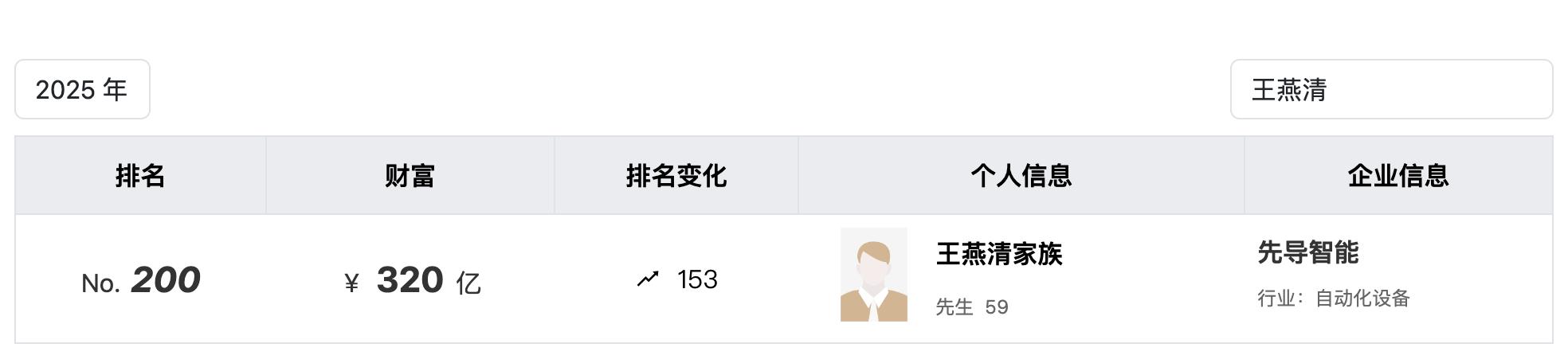 受此影响,先导智能实际控制人王燕清身价也是水涨船高,根据股权穿透,王燕清共持有公司29.31%的股权,根据最新收盘价格计算,该部分持股市值约为290亿元。根据胡润2025年百富榜数据,王燕清以320亿财富位列榜单第200位,排名较上年上升153位。