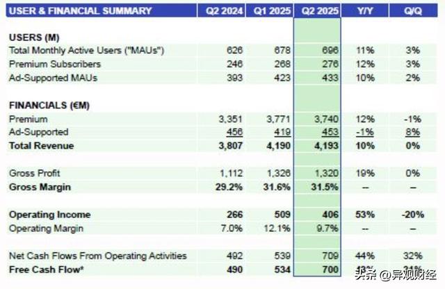 2、 月活用户规模方面,Spotify保持增长,TME却持续减少。2025年Q2,Spotify订阅用户和月活用户均实现两位数增长,月活用户达到6.96亿,订阅用户达到2.78亿。该公司高客户亲和度和低流失率,提高投资者对Spotify未来前景的信心。