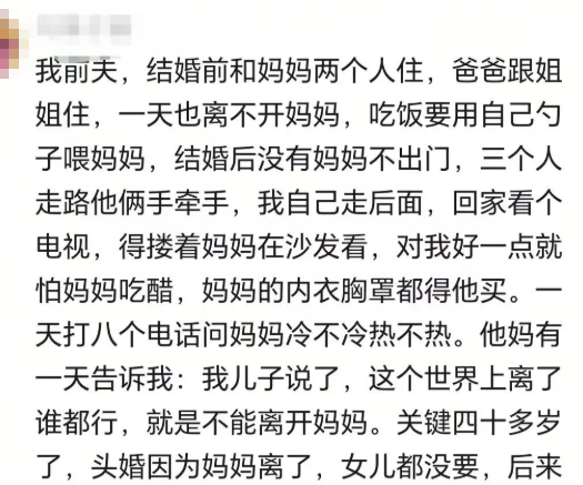 但我想说,凡是“妈宝男”,过于恋母的,几乎不可能经营好与妻子的家庭关系。当母子间失去边界,形成过度的依恋与占有时,会造成双重问题:对儿子而言,他从母亲那里获得了全部情感满足,便不再需要妻子,亲密关系自然名存实亡。这种“共生依赖”更会造就出事事依靠母亲的“巨婴”,使其在心理上无法真正成熟,甚至产生扭曲。