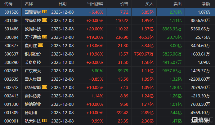 龙虎榜中涉及机构专用席位的个股中,单日净卖出额前三为广东宏大、太阳电缆、力星股份,分别为2.01亿元、1.07亿元、1.06亿元。