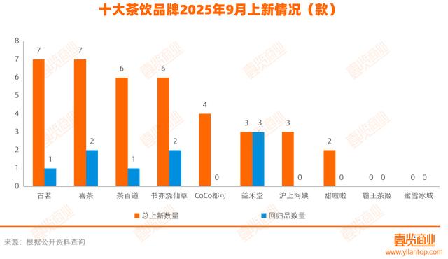 茶饮品牌中,古茗和喜茶在9月并列上新数量榜首,各自推出7款新品;茶百道和书亦烧仙草紧随其后,均上新6款。整体来看,主流茶饮品牌在秋季仍保持较密集的产品更新节奏。