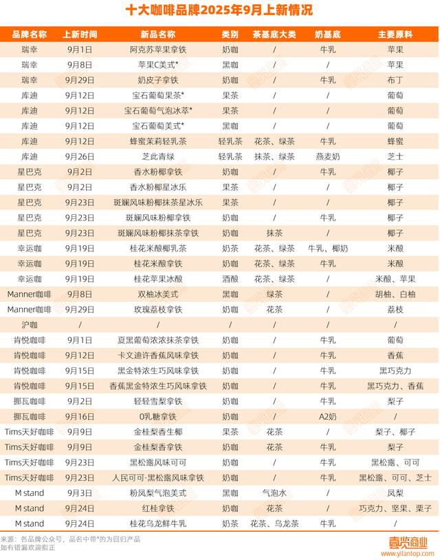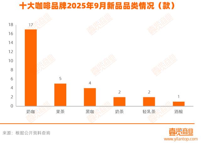 咖啡新品同样呈现出厚重化倾向,奶咖类产品成为推新重点。9月,咖啡品牌共推出17款奶咖新品,占当月咖啡新品总量的54.8%,同期果咖与黑咖的新品数量分别为5款和4款。