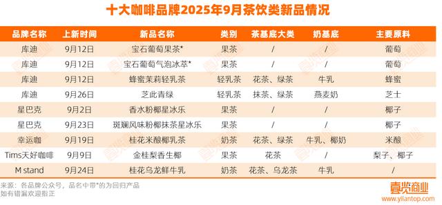 专业咖啡品牌也在加速布局茶饮领域,9月共由5个咖啡品牌上新9款茶饮类产品,其中库迪推出4款,占其9月新品总数的80.0%;星巴克上新2款星冰乐;幸运咖、Tims天好咖啡与M stand各推出1款茶饮新品。