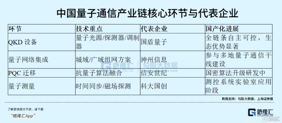 •量子通信:中国QKD技术全球领先,已建成全长4,600公里的“京沪干线”,并实现与“墨子号”卫星的天地一体化组网。产业链覆盖核心设备(国盾量子)、组网解决方案(神州信息)、终端应用(吉大正元)全环节。