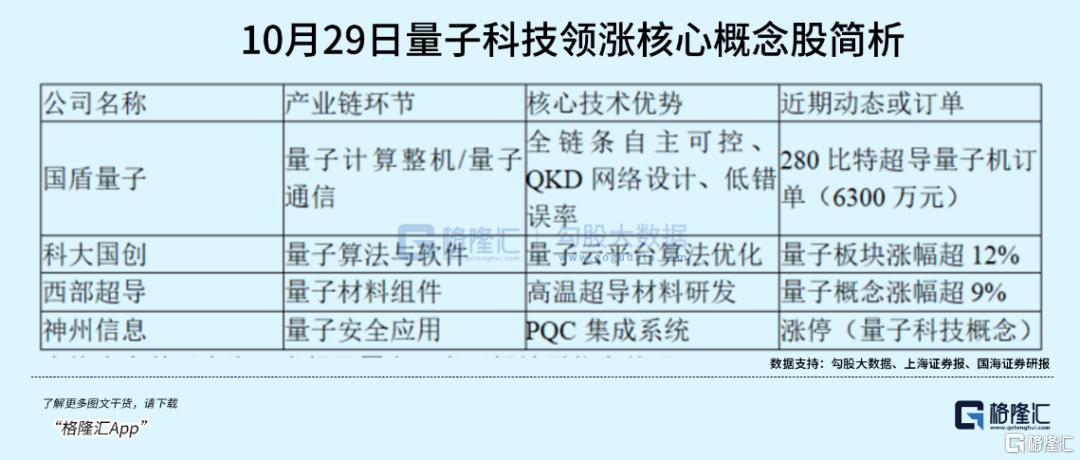 另外信安世纪、华工科技、吉大正元及格尔软件等相关概念股也有量子产业布局、股权投资或核心技术优势,建议关注后续政策或企业公告更新以获取详细分析。