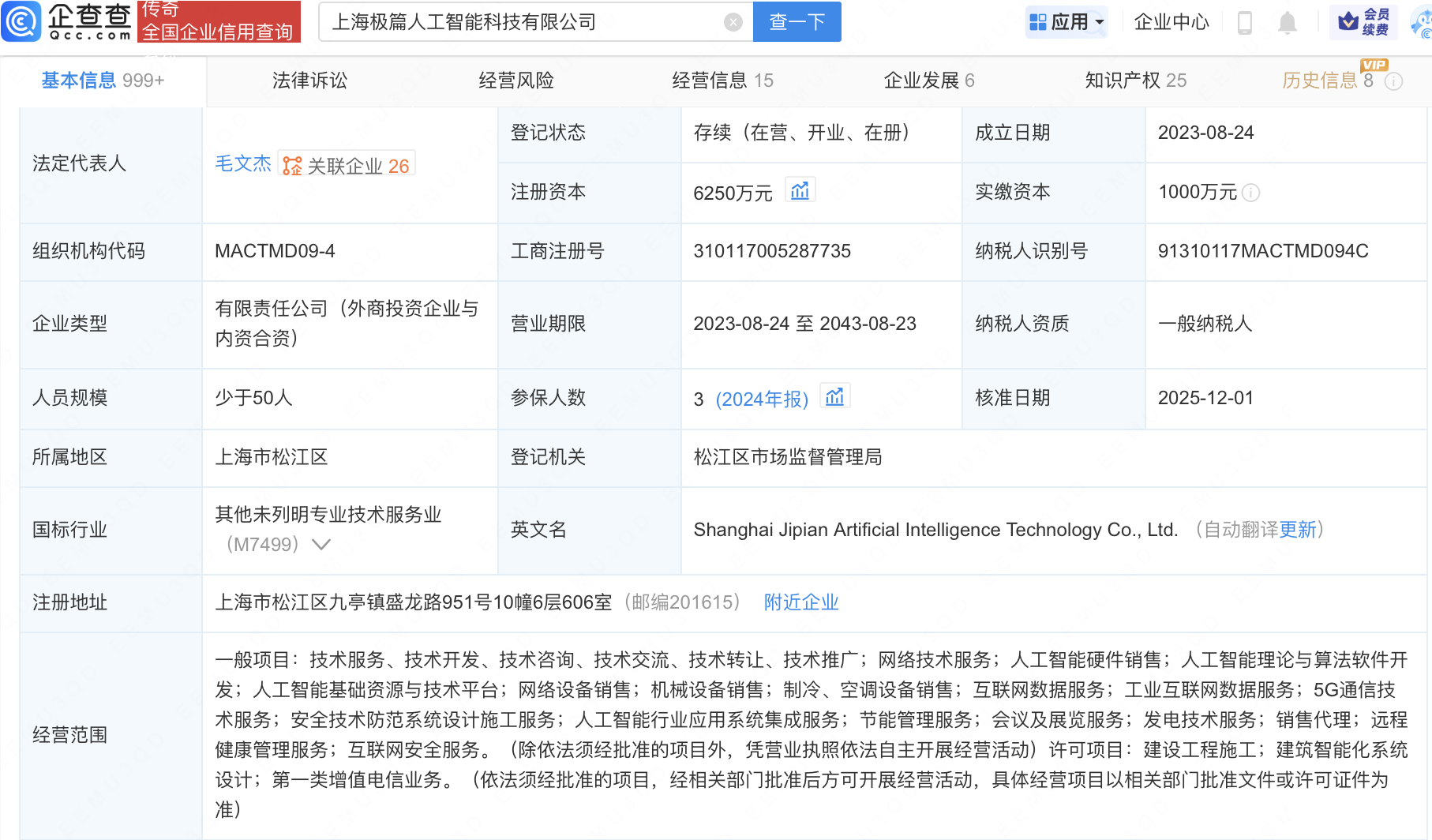 企查查APP显示,近日,上海极篇人工智能科技有限公司发生工商变更,新增华丰股份(605100)为股东,同时注册资本增至6250万元。企查查信息显示,该公司成立于2023年,法定代表人为毛文杰,经营范围包含:人工智能硬件销售;人工智能理论与算法软件开发;人工智能基础资源与技术平台等。