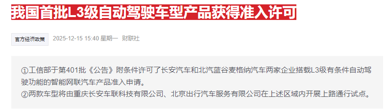 据工信部网站,近期,重庆长安汽车股份有限公司和北汽蓝谷麦格纳汽车有限公司两家汽车企业向工信部提交了搭载L3级有条件自动驾驶功能的智能网联汽车产品准入申请,根据《道路机动车辆生产企业及产品准入管理办法》等有关规定,经受理、审查、公示等程序,工信部于第401批《公告》附条件许可了相关产品。