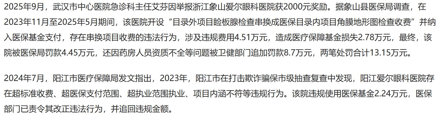值得注意的是,此次骗保风波虽不直接涉及爱尔眼科主体,但上市公司的合规记录同样不容乐观。2025年9月,武汉市中心医院急诊科主任艾芬举报浙江象山爱尔眼科医院串换项目收费,经查实造成医保基金损失2.78万元。这只是冰山一角,各地医保局对爱尔眼科旗下机构的处罚记录时有出现。