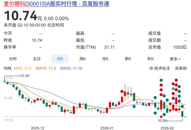 一石激起千层浪,尽管爱尔眼科紧急发布声明试图划清与涉事医院的界限,但资本市场反应迅速且果断。2026年2月6日爱尔眼科股价下跌约4%,最新市值定格在1000亿元附近,较其高峰时期的4000亿元市值已缩水约四分之三。