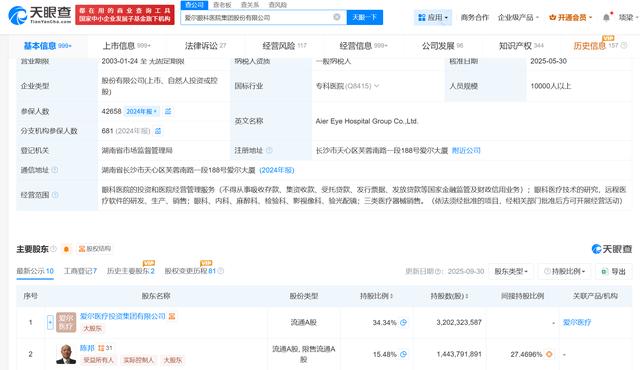 关键点在于,这家爱尔医疗投资集团,正是上市公司爱尔眼科的第一大股东,持股比例高达34.34%。而陈邦本人,则通过持有爱尔医疗投资集团79.99%的股份,成为这一系列公司的最终实际控制人。