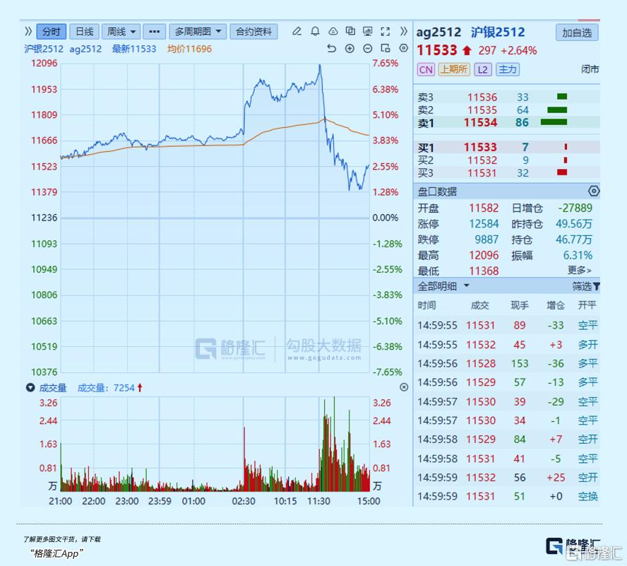 值得注意的是,今天开盘,黄金、白银期货价格都出现极显著的大涨,但午盘时段开始后两者价格均开始急速高空回落。黄金主力期货价格从大涨近5%一度回落至盘中涨1.8%并收涨2.7%,白银主力期货价格则从大涨7.7%快速回调至盘中涨幅近1%,但收涨2.64%,拉出一条很长的上影线。