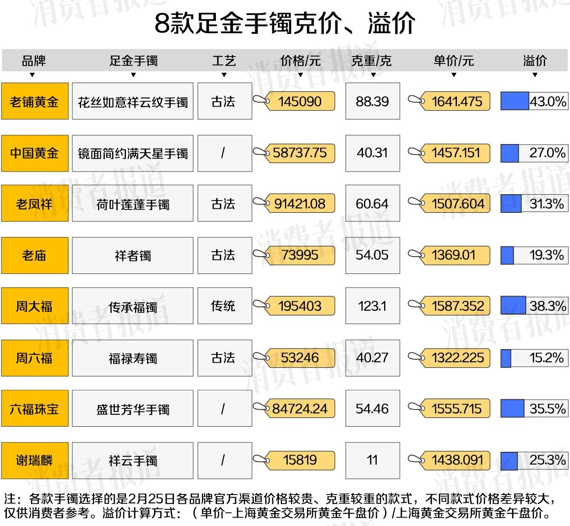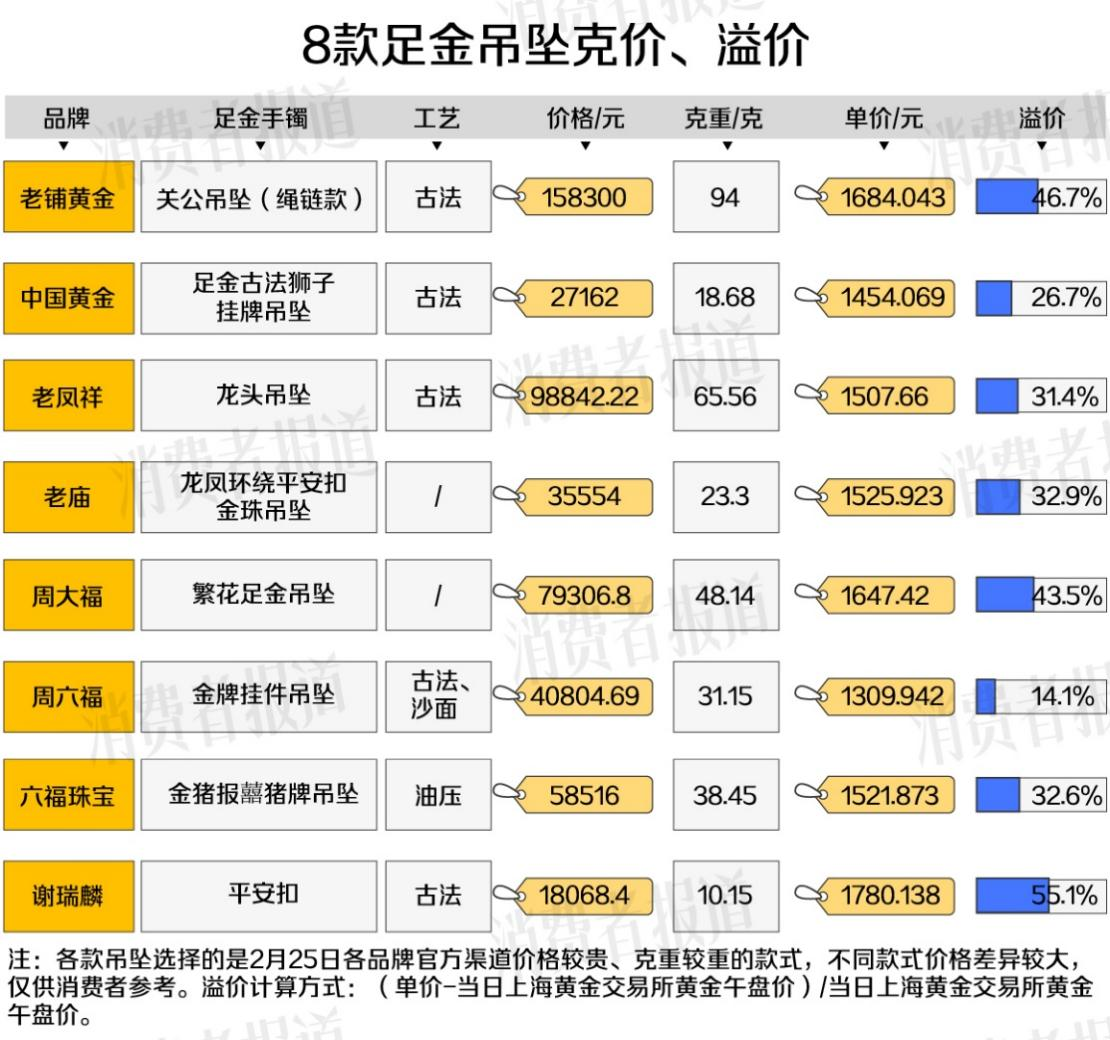 对此,《消费者报道》记者统计了某电商平台售价较高的8款足金手镯和8款足金吊坠的克价及溢价情况。