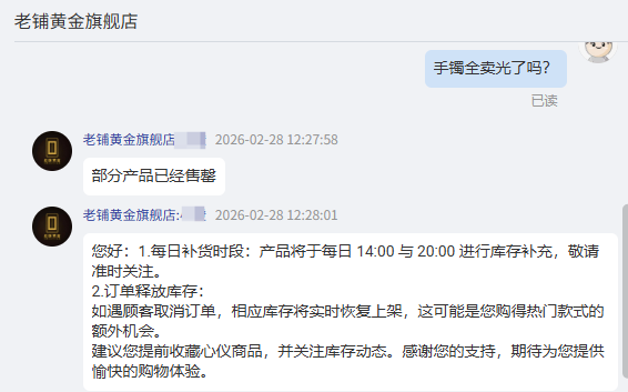 同时,记者发现前几天还有货的金镯子目前已经买不到,客服对此回复称:“部分产品已经售罄。补货时间段为每日14:00 与 20:00。”