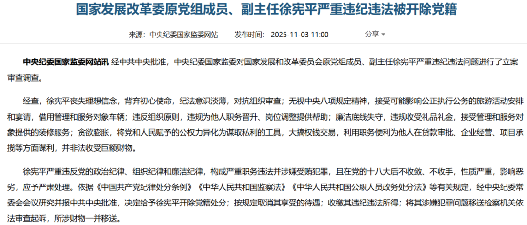 2025年11月,中央纪委国家监委网站通报,徐宪平被开除党籍,其涉嫌犯罪问题移送检察机关依法审查起诉。
