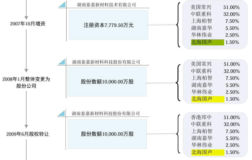根据泰嘉股份IPO招股书,2007年10月,公司进行第三次增资,引入上海柏智、湖南嘉华、华林伟业、北海国声四家新股东。