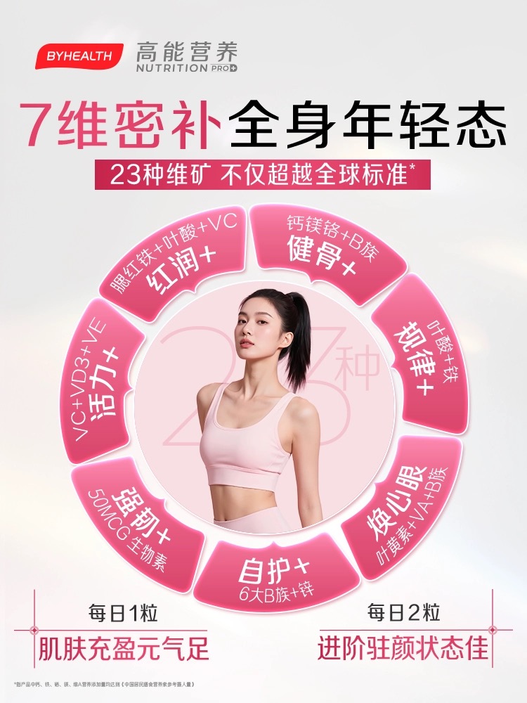 不过,也有产品定位为日常基础营养提升。以BYHEALTH(汤臣倍健) PQQ复合维生素双层片为例,它在添加PQQ和红石榴提取物的基础上,还添加了23种维生素与矿物质,旨在满足全面的基础营养需求。
