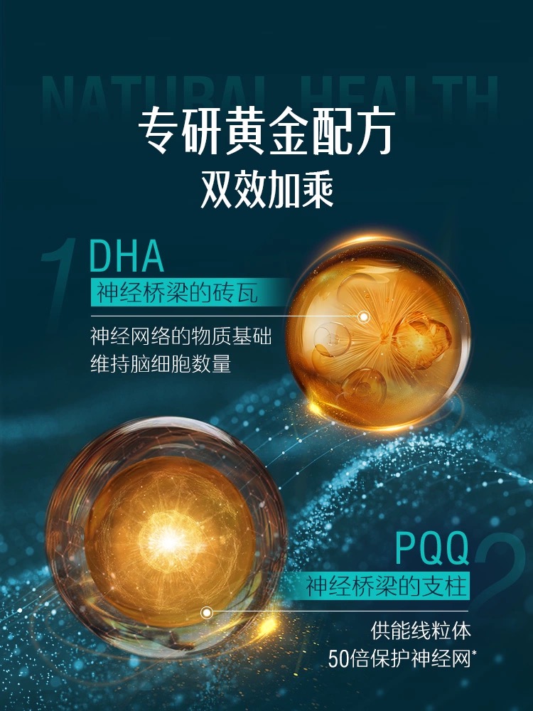 PQQ也常作为一种支持大脑与神经健康的成分。在此类配方中,它常与DHA、磷脂酰丝氨酸(PS) 等搭配。例如,Swisse(斯维诗)PQQ+DHA脑力鱼油将DHA比喻为“神经桥梁的砖瓦”、PQQ为“神经桥梁的支柱”,宣称能共同维护大脑健康。