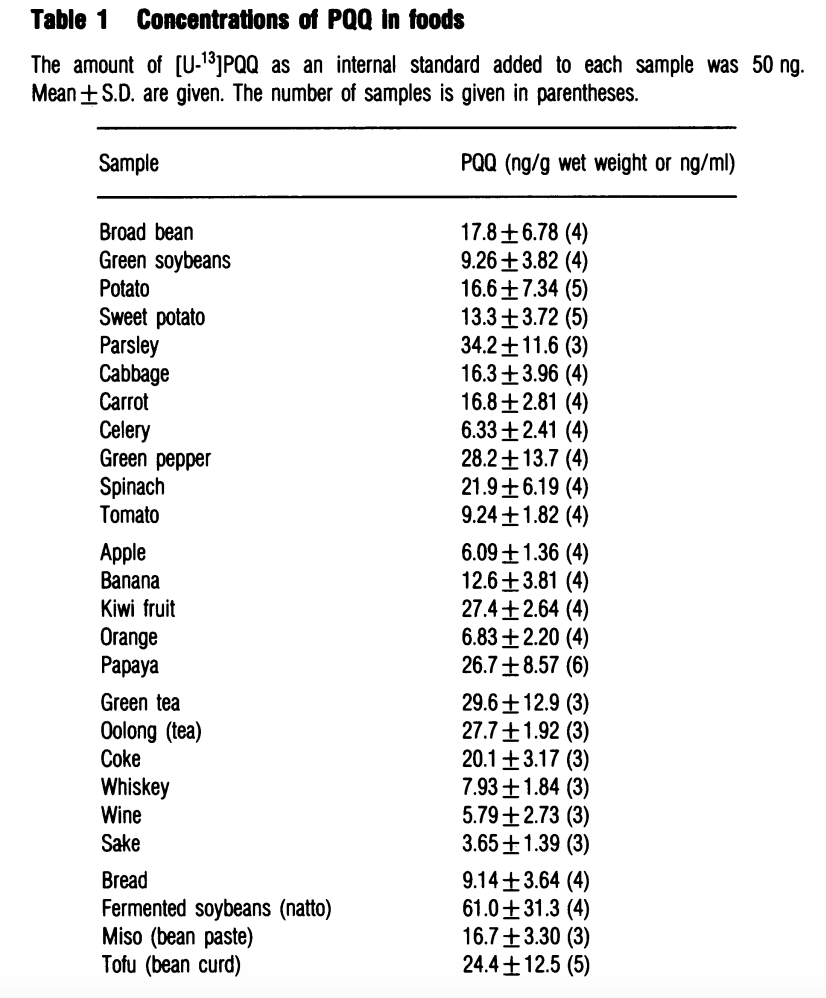 [4] T Kumazawa, K Sato, H Seno, A Ishii, O Suzuki; Levels of pyrroloquinoline quinone in various foods. Biochem J 15 April 1995; 307 (2): 331–333.