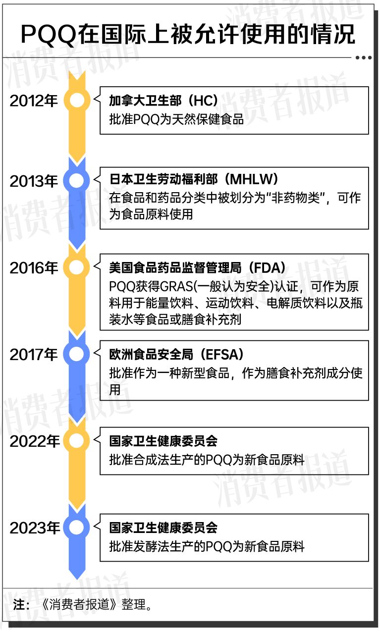 在中国,PQQ也已取得了合法身份。2022年3月,国家卫生健康委正式批准合成法生产的PQQ作为新食品原料;随后,在国家卫生健康委的2023年第8号公告中,发酵法生产的PQQ再次作为“三新食品”获得认可。值得注意的是,国内批准使用的均为稳定性较高的吡咯喹啉醌二钠盐(PQQ-Na₂)。