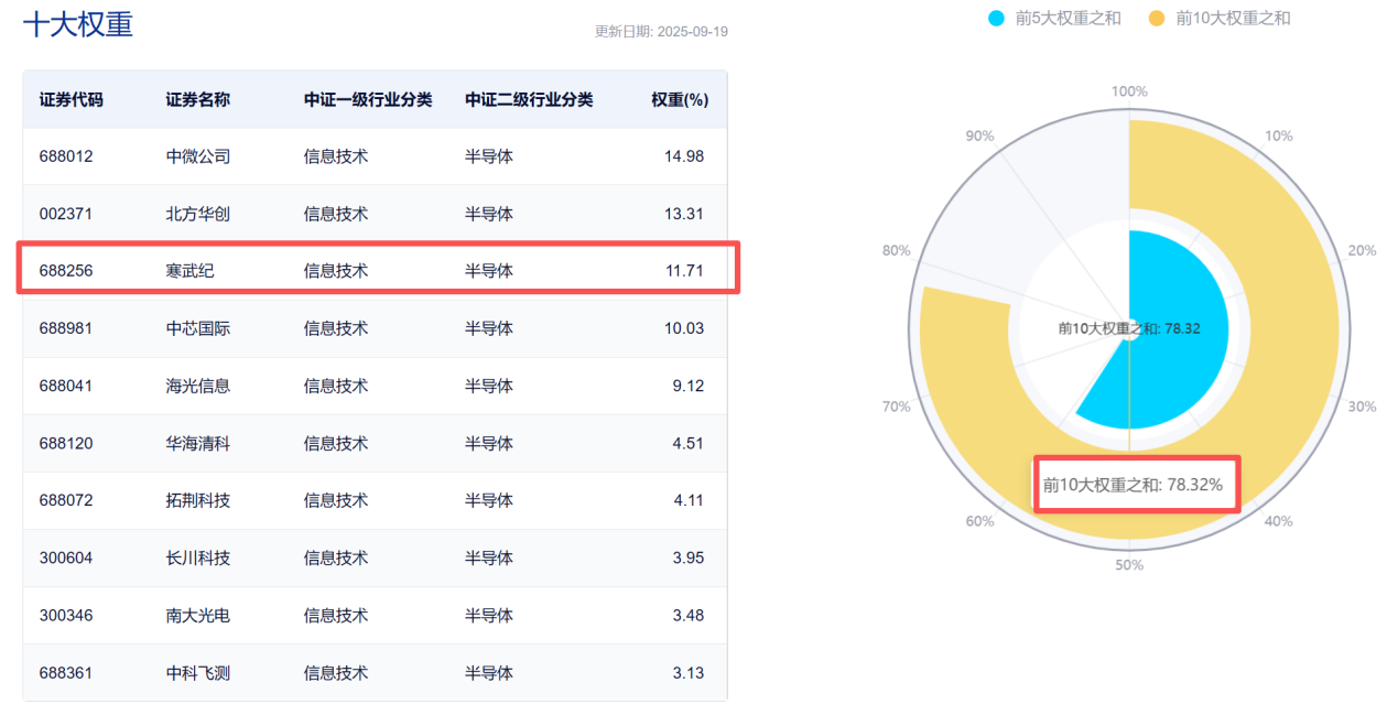 目前寒武纪作为A股稀缺的纯正云端AI芯片上市公司,已经是资本表达对国产算力赛道预期的主要出口。中证半导里寒武纪的权重占比高达11.71%,其他还有中微公司14.98%、北方华创13.31%、中芯国际10.03%,前十大集中度高达78.32%,都是国产替代最具有中坚力量的龙头公司,因为弹性对比同类指数更为突出。