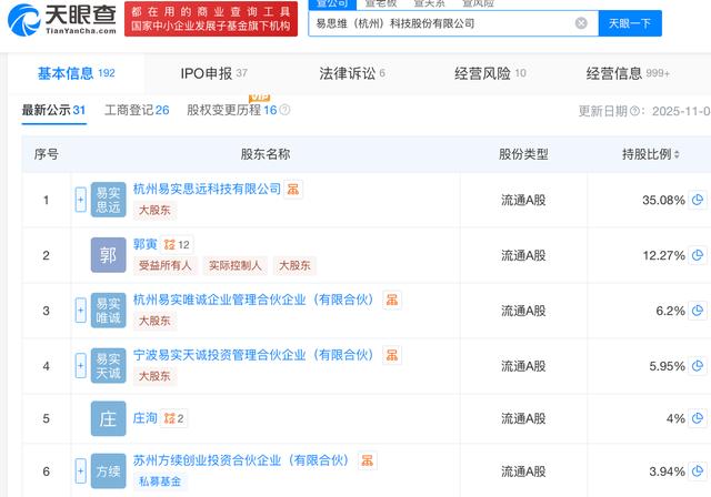 天眼查App信息显示,易思维成立于2017年12月,位于浙江省杭州市。目前,该公司的注册资本为7500万元,法定代表人为郭寅,主要股东包括杭州易实思远科技有限公司(下称“易实思远”)、郭寅等。