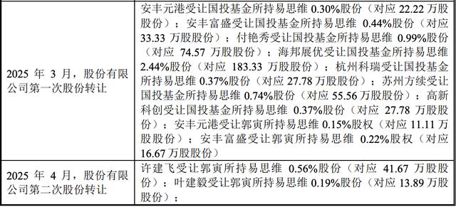 早前,国投基金曾参与对易思维的投资。而在2024年12月至2025年2月,国投基金则将所持股权分别转让给了安丰元港、安丰富盛、付艳秀、海邦展优、杭州科瑞、苏州方续、高新科创等,作价合计1.53亿元,每股成本为36元。