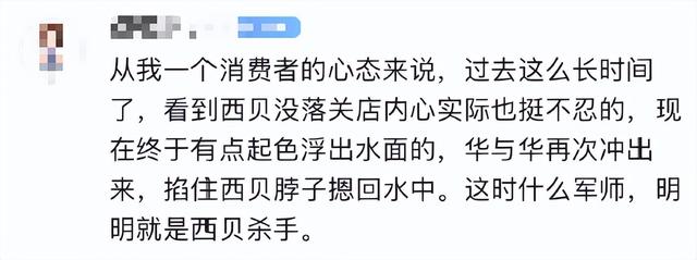 在罗永浩的评论区中,不乏“华与华是真想让西贝死”的调侃。另有消费者表示,在西贝好不容易有点起色浮出水面之际,华与华却再次冲出来掐住西贝的脖子摁回水中,做出这种行为的人显然不是军师,而是名副其实的“西贝杀手”。