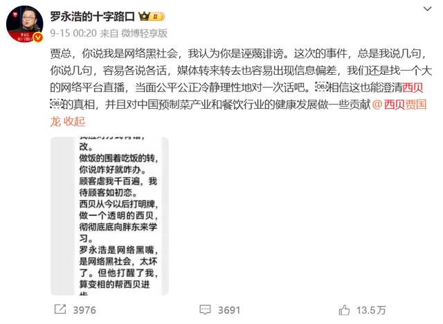 令人意外的是,仅仅过了两天罗永浩便在微博公开了贾国龙的完整发言,直指其造谣诽谤。截图显示,贾国龙虽然承认了西贝的不足,却在文章后半段怒斥罗永浩“是网络黑嘴、网络黑社会,太坏了”,并号召员工与其“开干”。