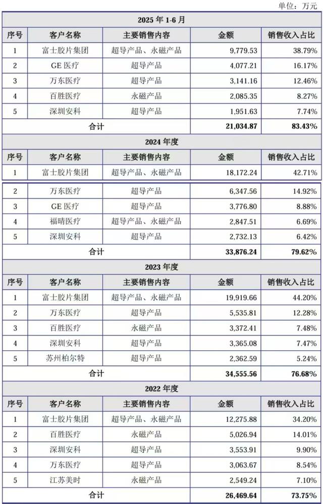 但需要注意的是,健信超导的主要客户相当集中,报告期内来自前五大客户的收入分别为2.65亿元、3.46亿元、3.39亿元和2.10亿元,占比分别达到73.75%、76.68%、79.62%和83.43%,其中第一大客户富士胶片集团占比稳定在30%以上。