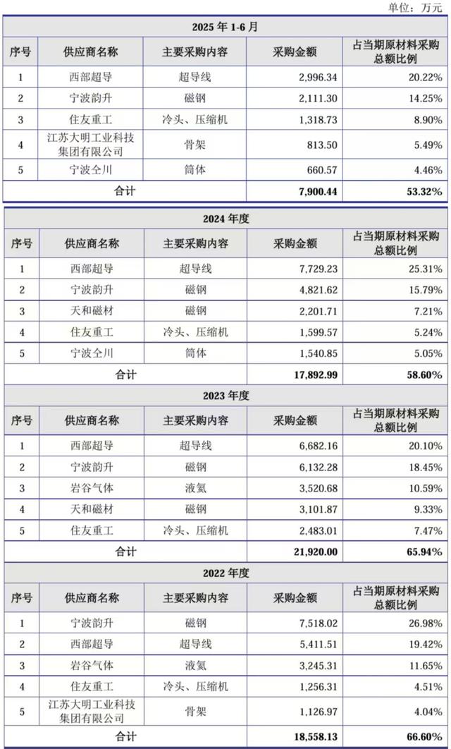 虽然健信超导表示其不存在严重依赖单一少数供应商的情形,但该公司的供应商集中度也当仁不让,报告期内向前五大供应商的采购金额占比分别达到66.60%、65.94%、58.60%和53.32%,其中宁波韵升、宁波仝川还与该公司存在关联关系。