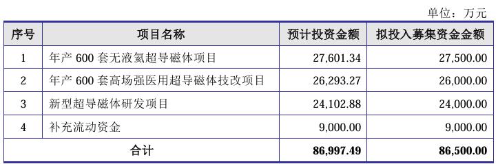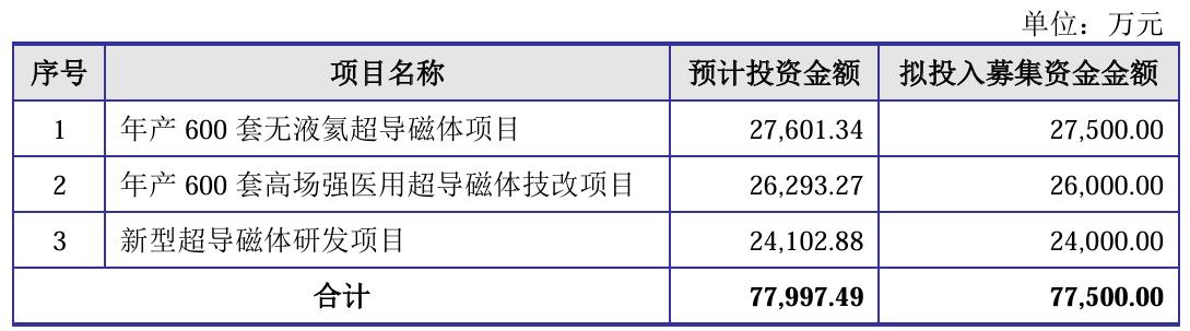 一片质疑声中,健信超导调整了募资方案,最新招股书(上会稿)显示,其9000万元补流项目被删除,募资规模也减少至7.75亿元,分别用于年产600套无液氦超导磁体、年产600套高场强医用超导磁体技改和新型超导磁体研发项目。