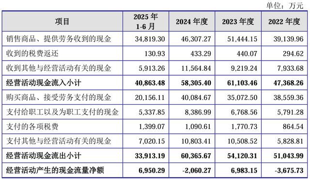 健信超导的现金流状况也相当严峻,报告期各期该公司经营活动产生的现金流量净额分别为-3675.73万元、6983.15万元、-2060.27万元和6950.29万元,曾在2022年、2024年两度出现现金流出情况。