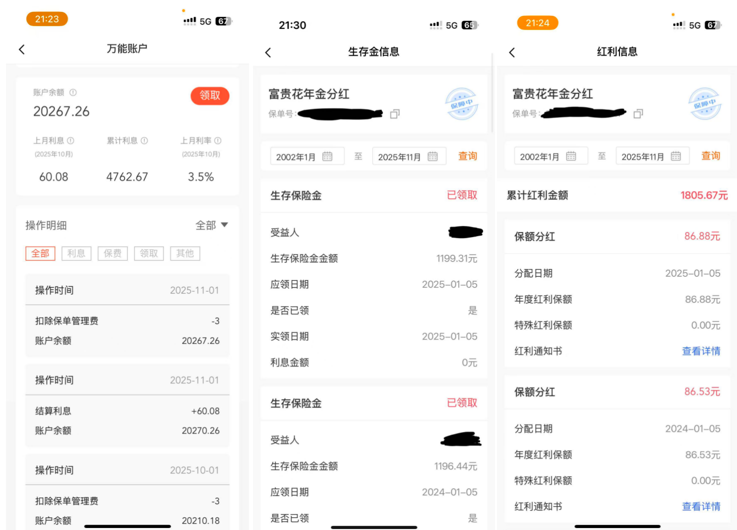 目前,这份保单每年产生不到1200元年金和数十元分红,加上万能账户(复利计息,年利率3.5%)的收益,年收益约1800元。值得注意的是,李荔提供的红利信息截图显示,2013年至今,该保单累计红利金额仅有1805.67元。
