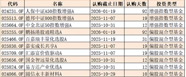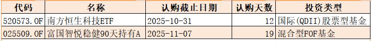 此外,还有两只基金比较另类,分别是国际(QDII)股票型基金南方恒生科技ETF,混合型FOF基金富国智悦稳健90天持有A,认购天数则为12、19天。