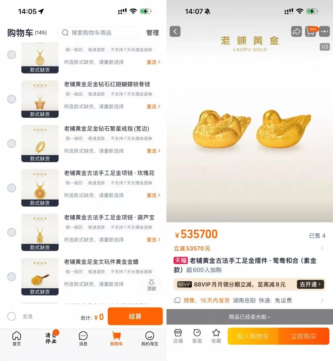 蓝鲸记者在现场观察到,队伍中有不少外地专程赶来的消费者,还有人自带了小马扎。期间很多人都在用手机持续刷新老铺黄金的线上店铺,时不时能够捡漏到一两件商品。伴随线上折扣活动的展开,人们将“老铺黄金买得几乎只剩下‘老铺’”,甚至连30多万的黄金蟾蜍、50多万的黄金鸳鸯摆件等都快速售罄。
