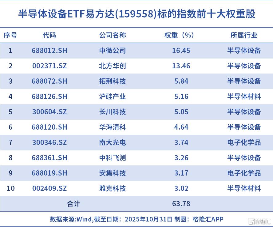 半导体设备ETF易方达(159558)高度契合国产替代主线,跟踪指数紧扣半导体两大“卡脖子”主线——半导体设备(60.9%)+半导体材料(22.5%),被市场视作产业链“卖铲子”的角色,成份股覆盖光刻机、蚀刻机、薄膜沉积设备及硅片、光刻胶等关键环节龙头企业,中微公司+北方华创权重近30%。