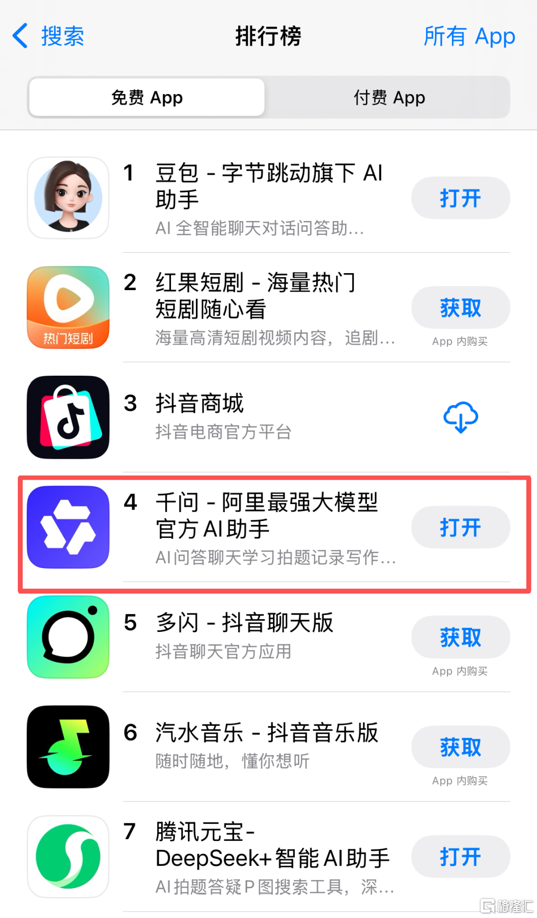 昨日阿里巴巴正式宣布“千问“项目,千问APP公测版上线。以“免费开放,人人可用”的姿态全力进军AI to C市场,围绕个人AI助手的市场争夺战已悄然升级。截至目前,千问APP在公测上线次日便迅速冲入苹果App Store免费应用总榜第四位,排名超越DeepSeek。
