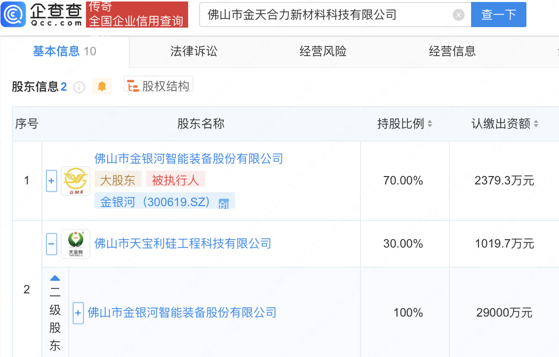 企查查APP显示,近日,佛山市金天合力新材料科技有限公司成立,注册资本3399万元,经营范围包含:电子专用材料制造;电子专用材料研发;电子专用材料销售;新型膜材料制造等。企查查股权穿透显示,该公司由金银河(300619)间接全资持股。